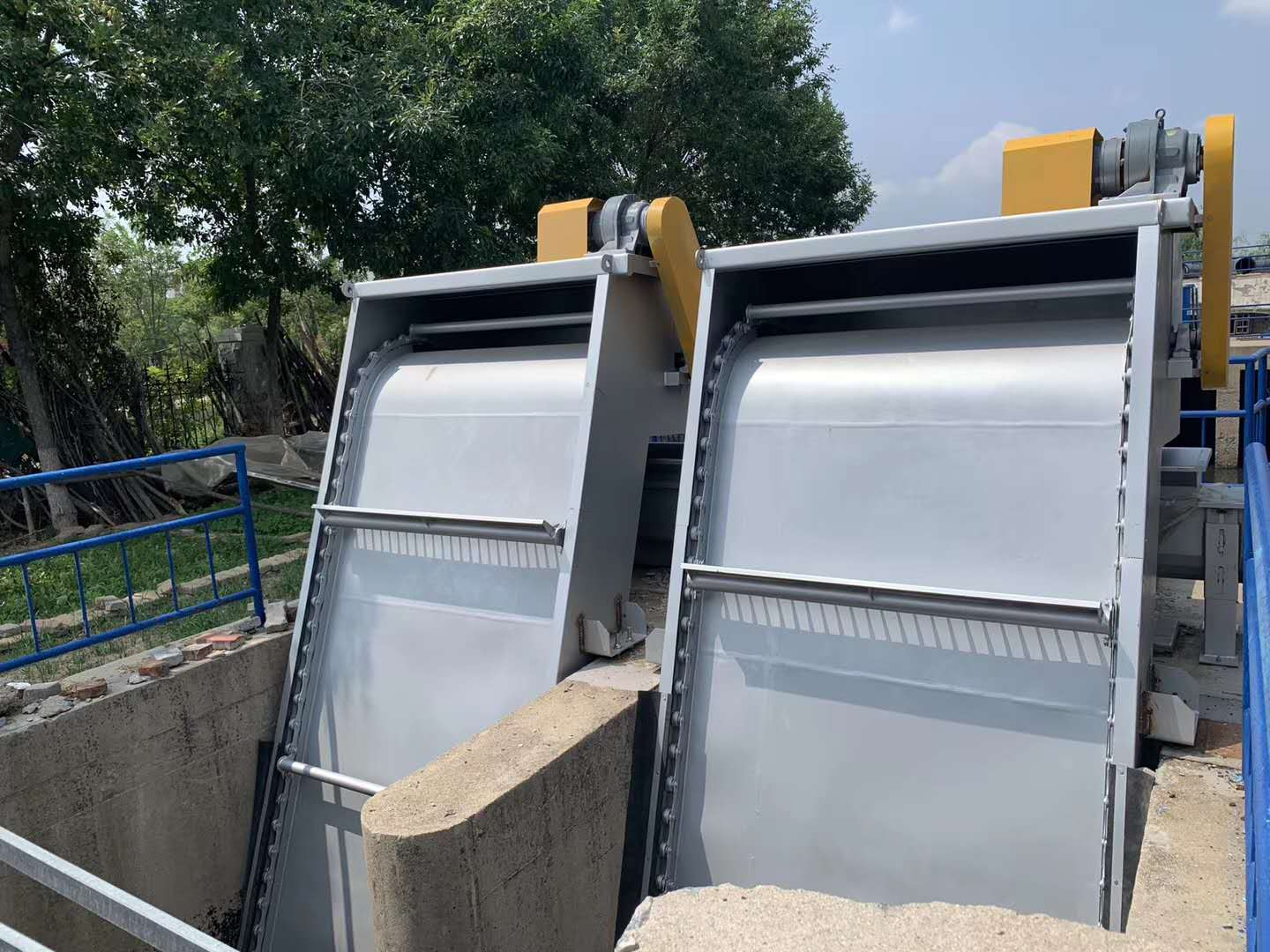 一種固(gù)定格柵除汙機,其柵條為圓弧形(近視1/4圓(yuán)周),齒耙(pá)在驅動裝置驅動下,沿圓弧形柵條將汙物推(tuī)至柵條(tiáo)上(shàng)方,實現汙渣清除。
